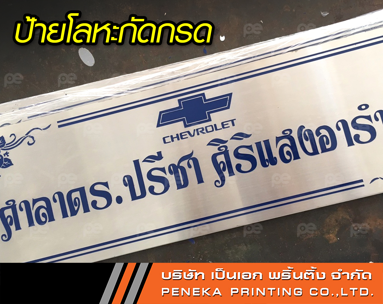 เป็นการกัดเนื้อโลหะลงไป สามารถทำได้ทั้ง กัดกรดสแตนเลส กัดกรดทองเหลือง และ กัดกรดทองแดง ซึ่งนอกจากจะกัดผิวโลหะตามลายที่เราต้องการแล้ว จะนิยมถมสีลงไปในส่วนที่ถูกกัดออกไปด้วย เพื่อเพิ่มความสวยงาม ชัดเจน โดดเด่น และหรูหรามากขึ้นค่ะ ใช้ได้ทั้งป้ายภายในและป้ายภายนอกนิยมใช้เป็นป้ายบริษัท ป้ายหน้าห้อง ป้ายบ้านเลขที่ ป้ายส่วนกลางต่างๆ
